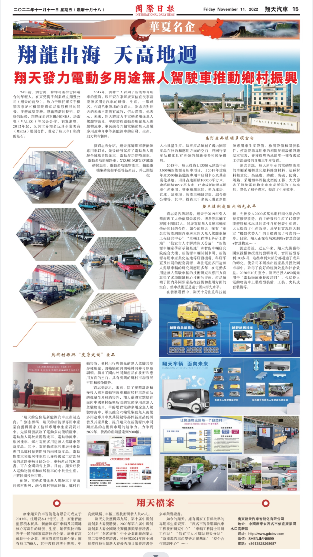 刘志勇告诉记者,翔天于2019年引入华南理工大学兰凤崇教授、博导等车辆工程博士团队7人,开展电动无人驾驶车辆产学研项目的合作。如今的翔天,拥有“茂名市智能网联汽车广东翔天无人驾驶车辆工程研究中心”“车辆工程博士科研工作站”“信宜市人才驿站翔天分站”“新能源车辆产学研示范基地”和智能车辆研究院综合大楼、新能源车辆试制车间、新能源专用车产业化基地等研发机构、科研平台及相关的配套资源,专注电动多用途无人驾驶车辆的研究与应用多年,在电动多用途无人驾驶车辆的技术研究和应用方面取得了多项关键核心技术的突破,产品填补了国内外同类产品在技术和应用方面的空白,整车技术更是处于国内领先水平。