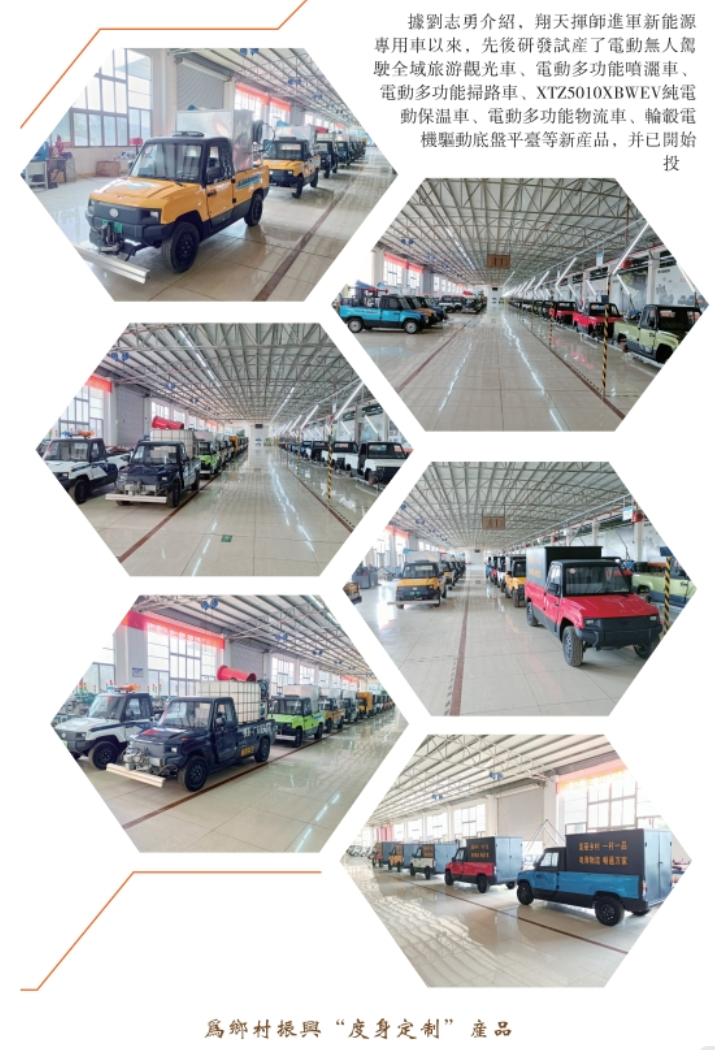 据刘志勇介绍,翔天挥师进军新能源专用车以来,先后研发试产了电动无人驾驶全域旅游观光车、电动多功能喷洒车、电动多功能扫路车、XTZ5010XBWEV纯电动保温车、电动多功能物流车、轮毂电机驱动底盘平台等新产品,并已开始投入小批量生产。这些产品填补了国内同类产品在技术和应用方面的空白,与同行业产品相比具有更强的创新优势和竞争优势。